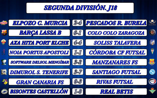 La Segunda División de la LNFS ha disputado la Jornada 18 dejando de nuevo a Pescados Rubén Burela como líder de la categoría ocupando la plaza de ascenso directo tras vencer al filial de ElPozo por 2-4. Real Betis vencía de forma rotunda a Bisontes Castellón por 1-8 que le asciende a la segunda plaza. Manzanares FS perdía en su lucha ante Mengíbar (3-2) y el filial azulgrana dejaba la victoria en casa ante Colo Colo (6-1). Córdoba Futsal y Noia Portus repartía puntos con un 1-1, al igual que Soliss Talavera y Elche que sellaban un 4-4. Por su parte, Rivas Futsal se sigue alejando del descenso esta vez ganando a G4an Canaria (3-0) y por último Santiago Futsal vencía al colista Dimurol S. Tenerife (3-7).